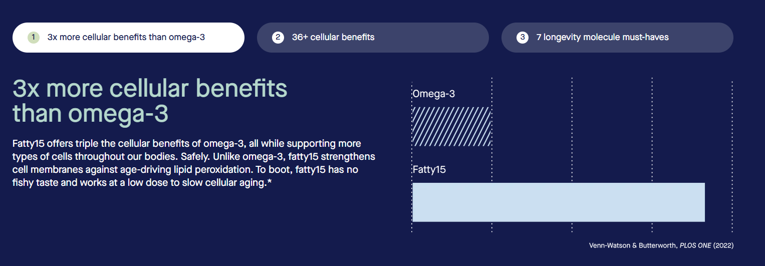 Fatty15 (C15:0) is an odd-chain saturated fatty acid, while omega-3s arepolyun saturated fatty acids. While both are beneficial fats that support healthy immune responses, they also have very different roles. For example, fatty15 is asturdy fat that strengthens our cell membranes and protects them against age-driving lipid peroxidation. In contrast, omega-3s are less stable fats that make ourcell membranes fexible but more susceptible to oxidation, especially as we age.The bottom line: Our bodies use both C15:0 and omega-3s to stay healthy, andthey can and should compliment each other. The upsides of fatty15 with pureC15:0? Tiny pills with no smell, no taste, and no burps. Better yet, when testedhead-to-head against pure EPA, fatty15 had 3x more cellular benefits relevant toour immune, metabolic, heart, and liver health. We recommend working with your health care provider to determine what supplement stack is best for you.Learn more about fatty15 compared to omega-3s.