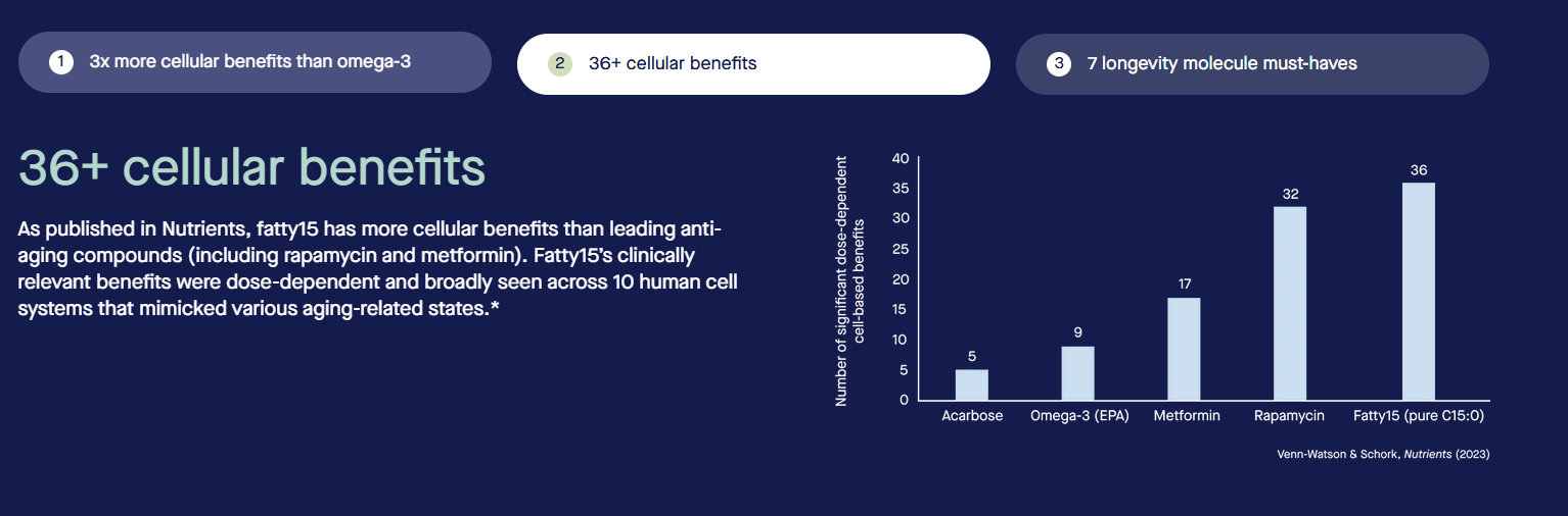 Today, more than 50 peer-reviewed scientific studies have linked C15:0 (aka,pentadecanoic acid) to better metabolic, heart, immune and liver health. Our>99.5% pure, vegan-friendly C15:0 fatty acid in fatty15 rebalances ourmetabolism naturally by 1) activating PPAR-alpha and delta receptors, the masterorchestrators of our metabolism, 2) activating AMPK pathways, which regulate glucose, 3) repairing mitochondria and enabling our cells to generate energy.Heck, that's a bunch of much-needed benefits to help keep our metabolism balanced.*